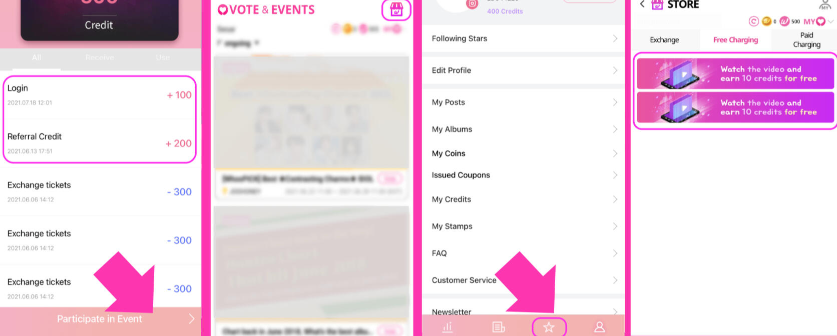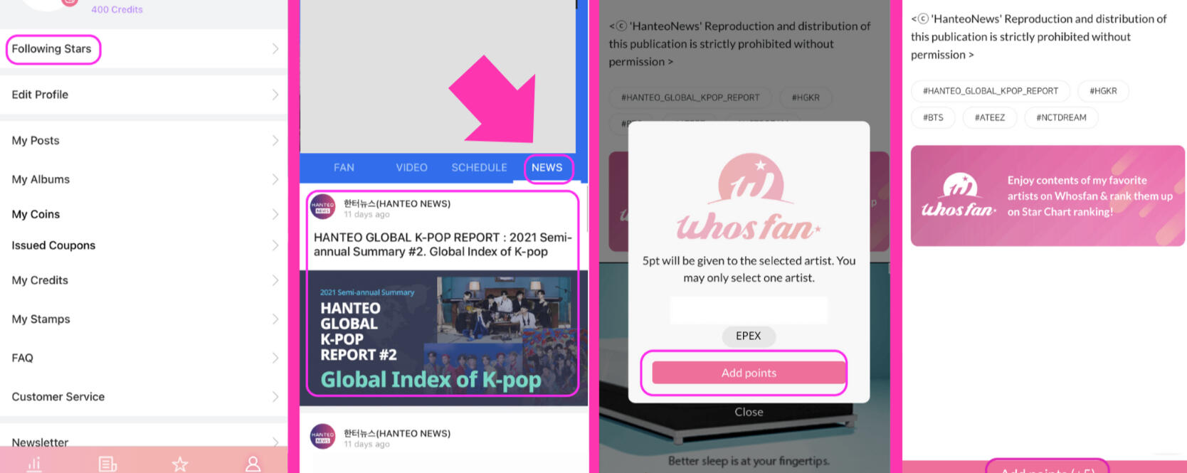 - You’ll be given +5 credits when you read articles. You can read as many articles as much as possible.1) Open My Page and choose Following Stars.