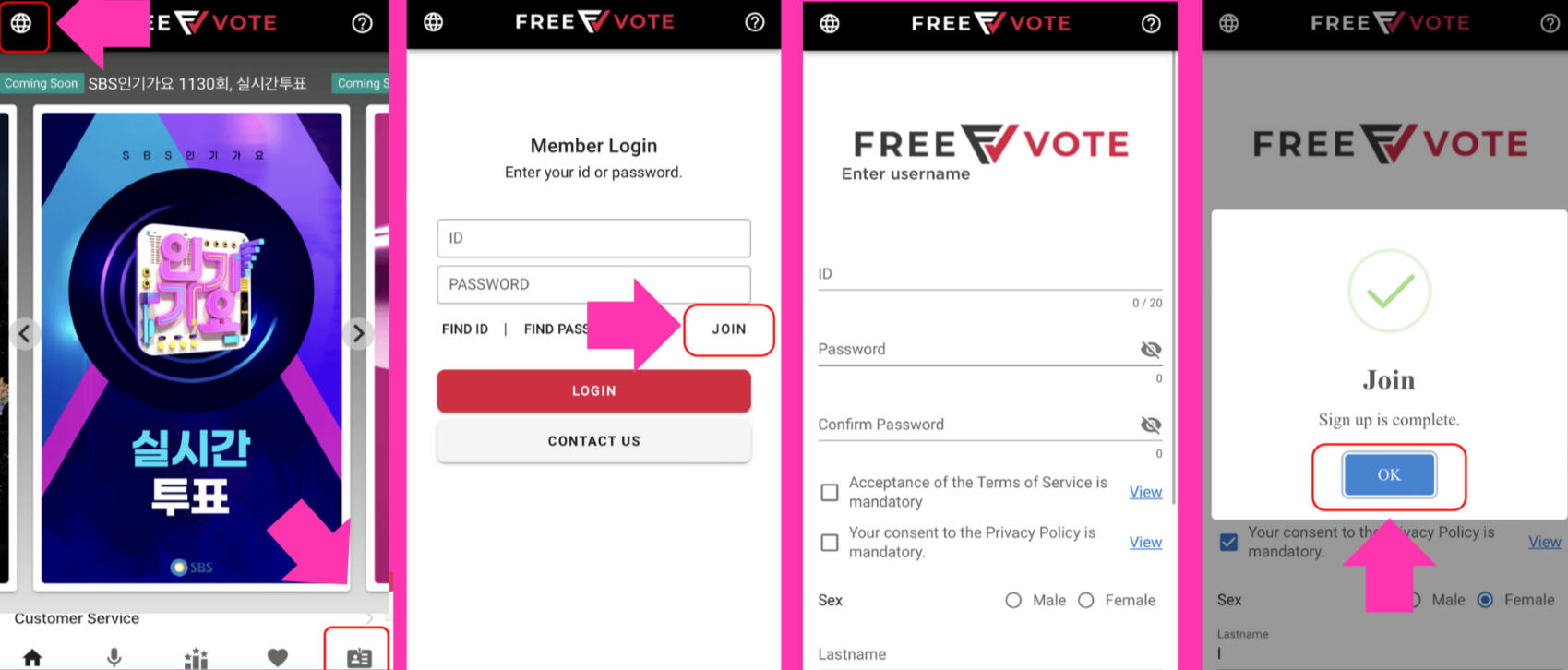 1. Change the language by clicking the globe icon.2. Sign Up by clicking the profile icon and JOIN.3. Fill up the required information and click the JOIN button at the bottom.4. A message is going to pup up saying the sign up is complete, click OK then you can log in.