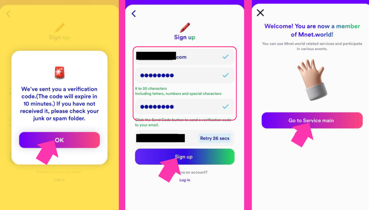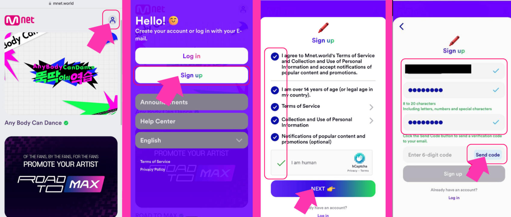 1. Go to https://www.mnet.world/2. Click the profile icon on the top right.3. Click ‘sign up’.4. Accept the required terms and conditions and click ‘next’.5. Create an account using an email address and create a password. Then click ‘send code’.6. Once you see this confirmation check your email.7. Type in the verification code given through your email and click ‘sign up’.8. Next you will be joining the community you want to vote in. NOTE : you must join a community to be able to vote in it.9. Click ‘go to service main’.